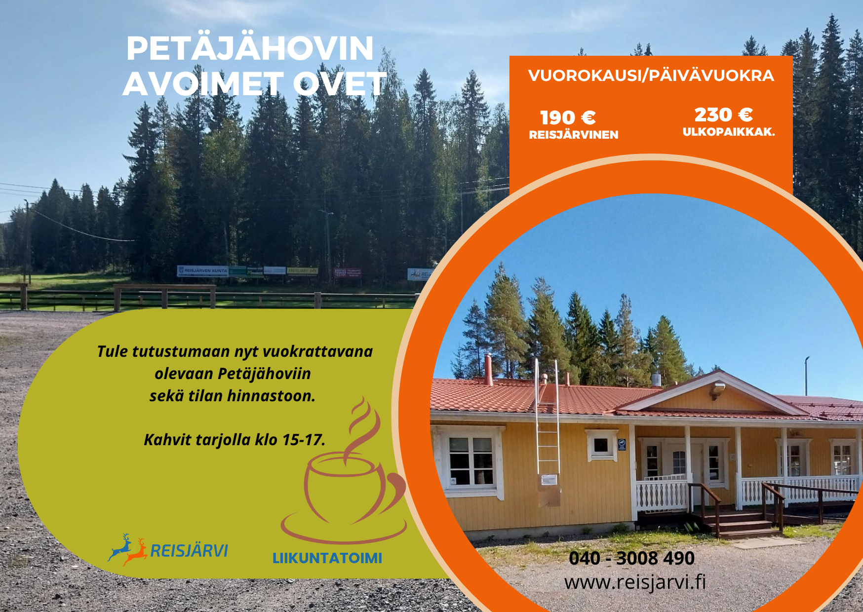 Tapahtuman tiedot 22.10.2025 15:00 - 22.10.2025 20:00 YleisötapahtumatPetäjähovi, Rintalantie 88Reisjärven kunta / Liikuntatoimi040-3008 490 Petäjähovin avoimet ovet Tulevat tapahtumat Petäjähovin omatoimiset aktiviteetit18.10.2025 00:01 Retki vuokattiin; Seikkailupuistoon,...21.10.2025 08:30 VUOKATTI TI 21.10. Seikkailupuisto, Superpark ja Katinkulta Lähtö kunnantalon edestä klo 08.30.... Kirjastokahvilat21.10.2025 12:00 Käsityökahvilat jatkuvat nyt kuukausittain! Tervetuloa mukaan Digikahvila kirjastolla22.10.2025 11:00 Tutustutaan yhdessä kirjaston digipalveluihin. Tervetuloa! Kaivopuiston kaunis Regina elokuva-...23.10.2025 13:00 Kirjastokahvilassa esitetään suomifilmien klassikko Toivo Särkän ohjaama Kaivopuiston kaunis Regina... Kaikki tapahtumat