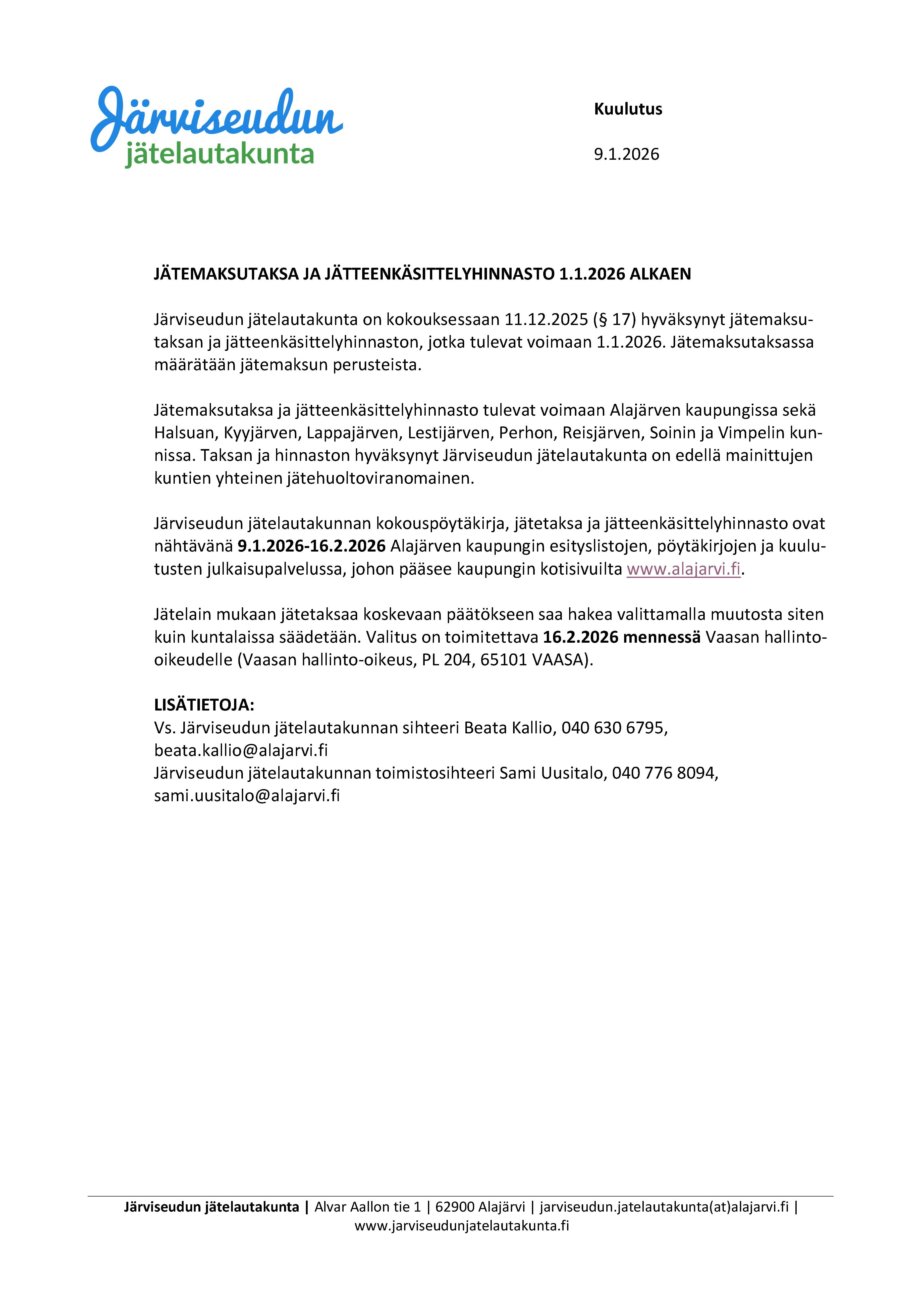 Kuulutus: Järviseudun jätelautakunta Jätemaksutaksa ja jätteenkäsittelyhinnasto 1.1.2026 alkaen